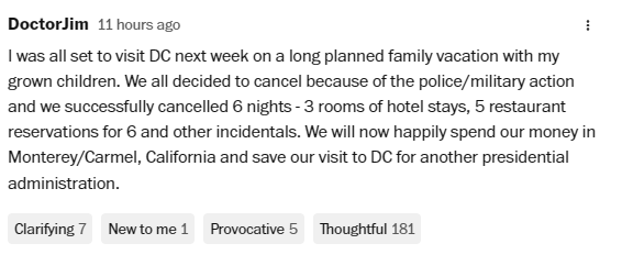 另一位網(wǎng)友則認(rèn)為,導(dǎo)致人們不敢去首都的原因是當(dāng)?shù)氐脑愀庵伟?,如果政府真能靠?qiáng)硬執(zhí)法把犯罪率打下來(lái),那游客自然會(huì)回到華盛頓特區(qū)。