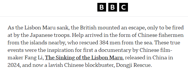 文章最后說,電影《東極島》將于8月22日在英國和美國上映;紀(jì)錄片《里斯本丸沉沒》目前正在英國通過奧德賽中文電影頻道網(wǎng)站播放,以紀(jì)念中國人民抗日戰(zhàn)爭(zhēng)暨世界反法西斯戰(zhàn)爭(zhēng)勝利80周年。
