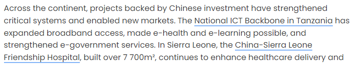 文章說,中國在非洲投資支持的項(xiàng)目夯實(shí)了關(guān)鍵系統(tǒng)根基,催生了新興市場。文章舉例說,坦桑尼亞的國家信息通信技術(shù)寬帶骨干網(wǎng)項(xiàng)目顯著拓寬了寬帶覆蓋范圍,讓線上醫(yī)療和線上學(xué)習(xí)成為可能,并強(qiáng)化了電子政務(wù)服務(wù)體系;塞拉利昂的中塞友好醫(yī)院持續(xù)提升當(dāng)?shù)氐尼t(yī)療服務(wù)水平,在抗擊埃博拉疫情期間發(fā)揮了關(guān)鍵作用……文章說,這些項(xiàng)目的故事或許不會成為西方媒體的頭條新聞,但它們實(shí)實(shí)在在提振了市場,培養(yǎng)了勞動技能,為非洲企業(yè)的蓬勃發(fā)展創(chuàng)造了條件。