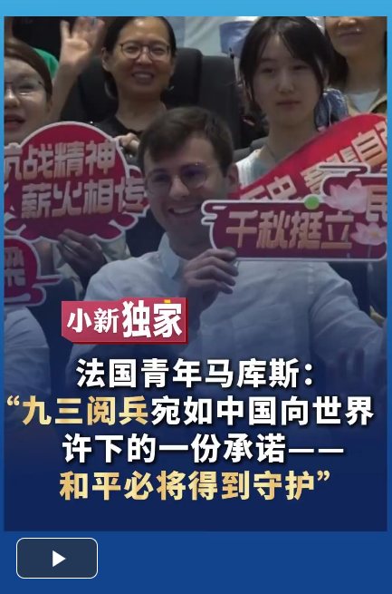 9月3日,法國青年馬庫斯在北京一家電影院通過4K超高清大熒幕觀看了紀(jì)念中國人民抗日戰(zhàn)爭暨世界反法西斯戰(zhàn)爭勝利80周年大會的電視直播。直播結(jié)束后,馬庫斯在接受中新社記者采訪時表示,整個閱兵活動給他留下了極為深刻的印象,它宛如一份向世界許下的承諾——和平必將得到守護(hù)。(謝龍飛 何凌霄 視頻制作 田敏娜)