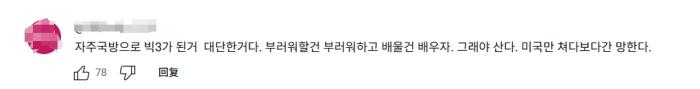 有韓國(guó)網(wǎng)友表示,對(duì)中國(guó)除了羨慕還是羨慕,韓國(guó)一定要向中國(guó)學(xué)習(xí),如果(韓國(guó))只看美國(guó)的眼色,就會(huì)“亡國(guó)”。