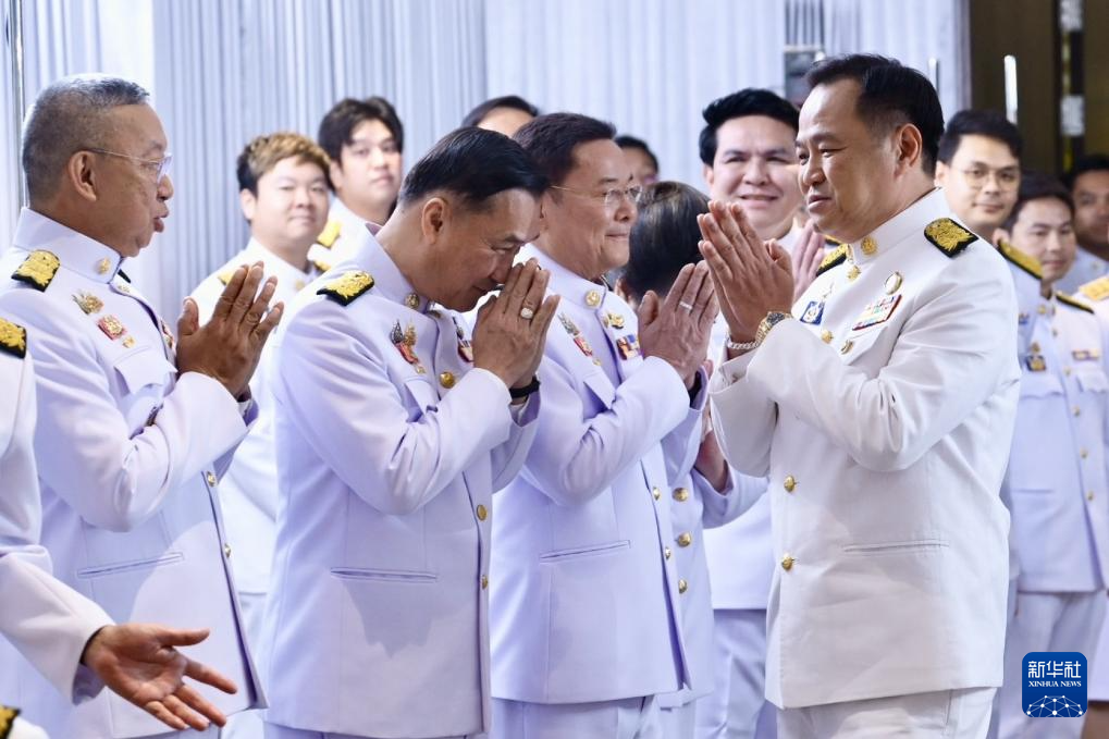 9月7日,在泰國首都曼谷,新任泰國總理阿努廷·參威拉軍(前右)接受祝賀。新華社發(fā)(泰國總理府發(fā)言人辦公室供圖)