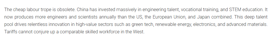 中國在工程人才、職業(yè)培訓以及科學、技術(shù)、工程和數(shù)學教育等方面投入了大量資金?,F(xiàn)在,它每年培養(yǎng)的工程師和科學家比美國、歐盟和日本的總和還要多。這種深厚的人才庫推動了綠色技術(shù)、可再生能源、電子和先進材料等高價值領(lǐng)域的不懈創(chuàng)新。