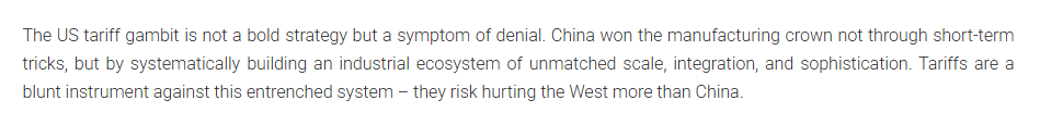 文章指出,美國的關(guān)稅策略不是一項大膽的戰(zhàn)略,而是否認現(xiàn)實的癥狀。中國贏得制造業(yè)桂冠不是通過短期手段,而是通過系統(tǒng)地建立一個規(guī)模、一體化和復雜程度無與倫比的工業(yè)生態(tài)系統(tǒng)。
