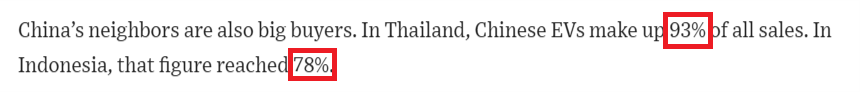 其次,中國(guó)的鄰國(guó)也是電動(dòng)汽車的大買家。在泰國(guó),中國(guó)電動(dòng)汽車占總銷量的93%。在印度尼西亞,這一數(shù)字達(dá)到了78%。