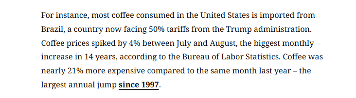 對于漲價,美國消費市場的現(xiàn)實數(shù)據(jù)中已有所體現(xiàn):受對巴西征收50%關(guān)稅影響,咖啡價格在7月至8月間飆升4%,創(chuàng)14年來最大月度漲幅;對墨西哥西紅柿征收17%關(guān)稅后,8月美國西紅柿價格漲幅達4%。