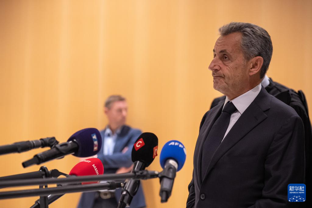 9月25日,在法國巴黎,法國前總統(tǒng)薩科齊在庭審后接受媒體采訪。新華社發(fā)(奧雷利安·莫里薩爾攝)