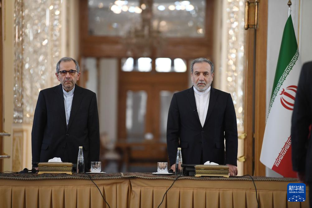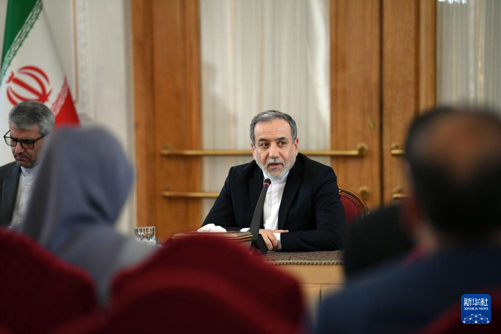 10月5日,在伊朗首都德黑蘭,伊朗外交部長阿拉格齊(右)對多國駐伊朗外交人員發(fā)表講話。新華社記者 沙達(dá)提 攝