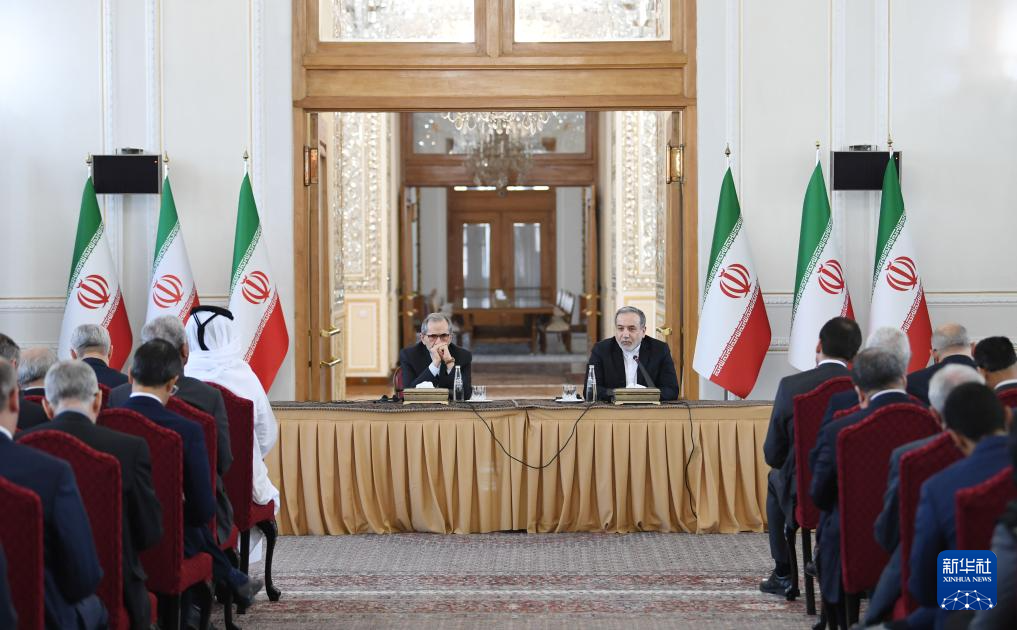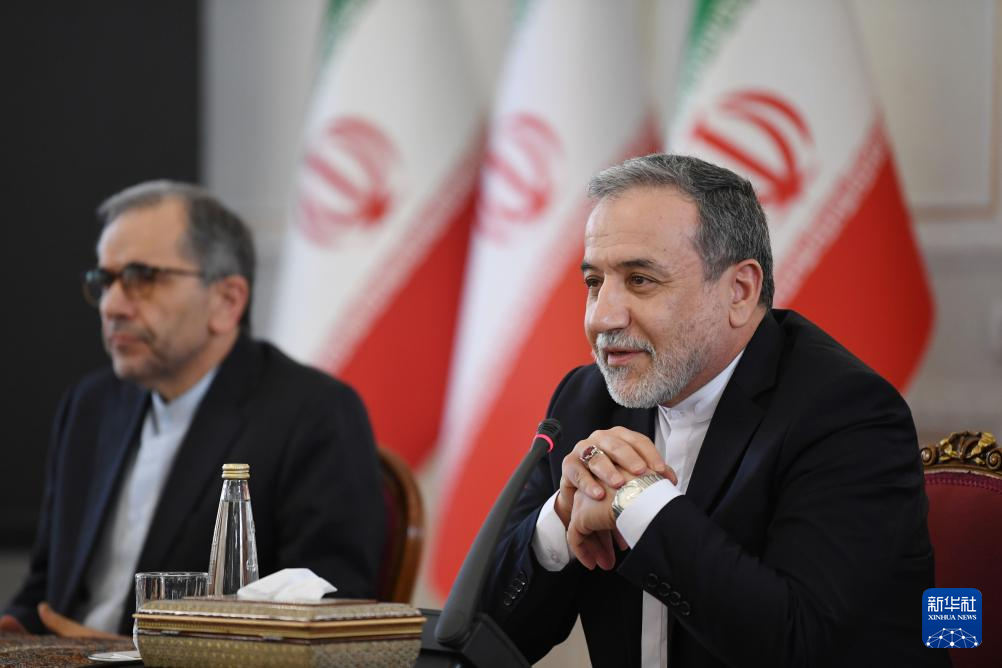 10月5日,在伊朗首都德黑蘭,伊朗外交部長阿拉格齊(右)出席與多國駐伊朗外交人員舉行的會議。新華社記者 沙達(dá)提 攝