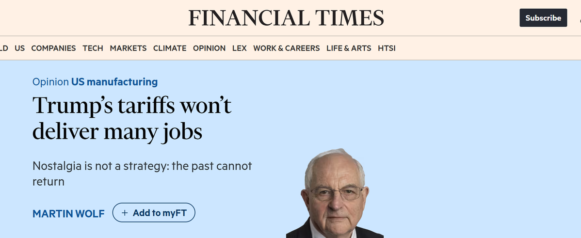 英國(guó)《金融時(shí)報(bào)》副總編及首席經(jīng)濟(jì)評(píng)論員馬丁·沃爾夫(Martin Wolf)8日發(fā)表評(píng)論文章稱,事實(shí)表明,特朗普政府推行的貿(mào)易保護(hù)主義政策,并未兌現(xiàn)其對(duì)選民所作的核心承諾——為美國(guó)創(chuàng)造大量制造業(yè)就業(yè)崗位,尤其是面向那些曾經(jīng)依賴傳統(tǒng)工業(yè)、如今卻面臨地區(qū)經(jīng)濟(jì)衰落困境的工人群體。他進(jìn)一步指出,這一承諾本質(zhì)上是空洞的,其政策實(shí)質(zhì)是為政府自身及其背后的富豪階層牟取利益。