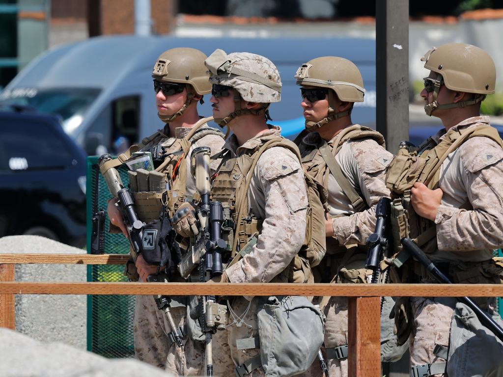 2025年6月13日,美國海軍陸戰(zhàn)隊(duì)士兵在洛杉磯威爾希爾聯(lián)邦大樓的入口處站崗。新華社發(fā)(邱晨攝)