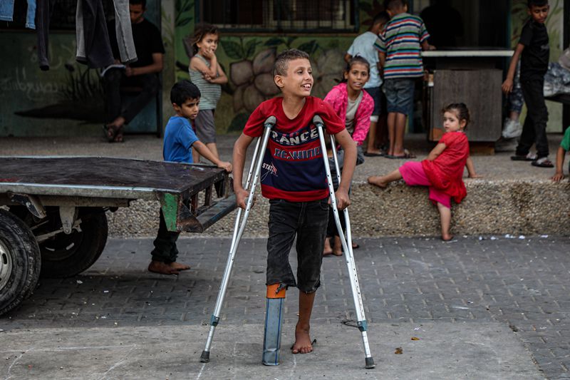 10月5日,年僅10歲的少年拉提卜·阿布·卡里克在加沙地帶中部代爾拜拉赫附近的聯(lián)合國(guó)臨時(shí)安置機(jī)構(gòu)內(nèi)拄著拐杖行走。在數(shù)月前的一次以色列空襲中,拉提卜失去了右腿致殘,他的母親和兄弟也在襲擊中身亡。 新華社發(fā)(里澤克·阿卜杜勒賈瓦德攝)