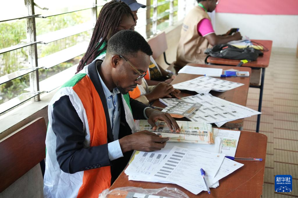 10月25日,工作人員在科特迪瓦經(jīng)濟首都阿比讓的一處投票站核實選民信息。新華社記者 張健 攝