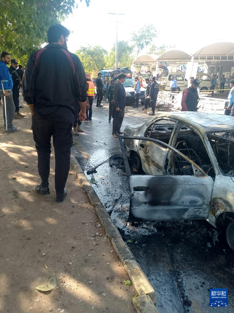 11月11日,在巴基斯坦首都伊斯蘭堡,安全和救援人員檢查爆炸現(xiàn)場(手機(jī)照片)。新華社發(fā)