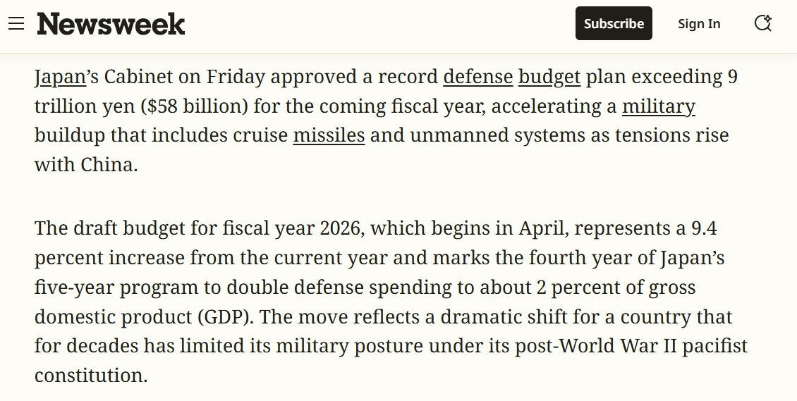 日本政府12月26日批準(zhǔn)2026財(cái)年(2026年4月至2027年3月)預(yù)算案,其中防衛(wèi)預(yù)算超9萬億日元,再創(chuàng)歷史新高。其展現(xiàn)出的日本負(fù)面軍事動(dòng)向,受到國際媒體關(guān)注。