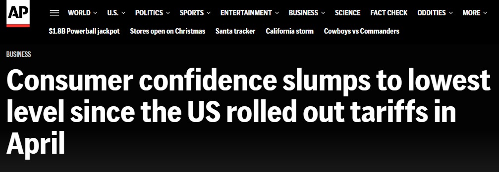 報(bào)道稱(chēng),根據(jù)調(diào)查給出的書(shū)面回復(fù),盡管美國(guó)政府一再聲稱(chēng)通脹是騙局,但物價(jià)上漲和通脹加劇,連同關(guān)稅問(wèn)題,仍然是消費(fèi)者最大的擔(dān)憂(yōu)。美國(guó)消費(fèi)者對(duì)當(dāng)前經(jīng)濟(jì)狀況的評(píng)估暴跌9.5點(diǎn)至116.8。