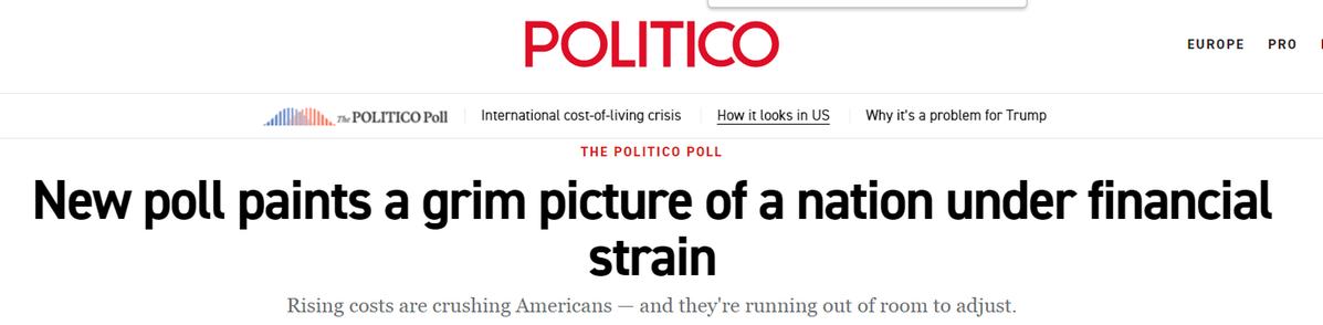 美國(guó)政客新聞網(wǎng)(Politico)12月發(fā)布的最新民調(diào)勾勒出一幅更為嚴(yán)峻的圖景:近半數(shù)美國(guó)人難以負(fù)擔(dān)雜貨、公用事業(yè)、醫(yī)療、住房和交通;因顧忌成本,27%的人不再體檢,23%的人跳過處方藥;55%的民眾將高物價(jià)歸咎于美國(guó)政府。即使在其支持者中,也有21%認(rèn)為關(guān)稅目前損害經(jīng)濟(jì)。