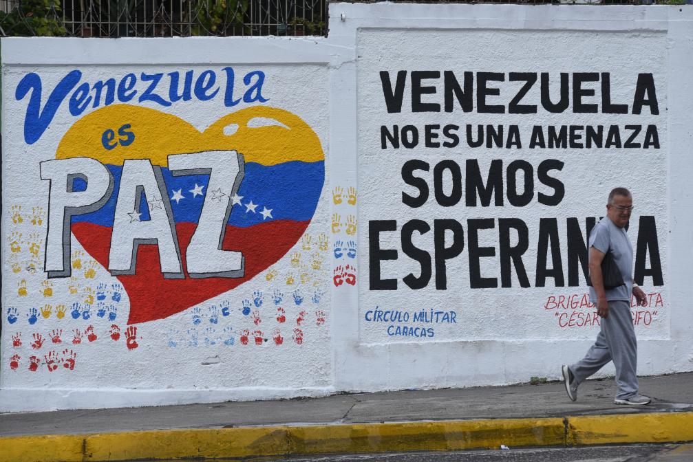 2025年9月22日,在委內(nèi)瑞拉首都加拉加斯,行人從街頭的宣傳標(biāo)語前走過。標(biāo)語上寫著“委內(nèi)瑞拉是和平國(guó)度”“委內(nèi)瑞拉不是威脅,而是希望”。新華社發(fā)(馬科斯·薩爾加多攝)