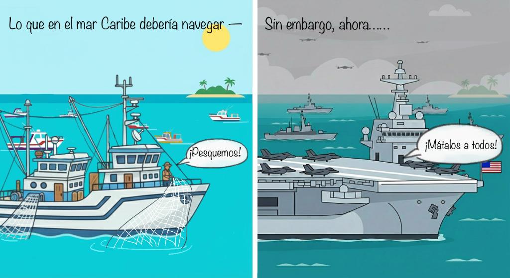 漫畫《“加勒比海盜”》。畫面左側(cè),航行在加勒比海上的本該是收獲滿滿的漁船。但在畫面右側(cè),現(xiàn)如今的加勒比海陰云密布、軍艦成群,回蕩著美軍“不留活口”的口號(hào)。