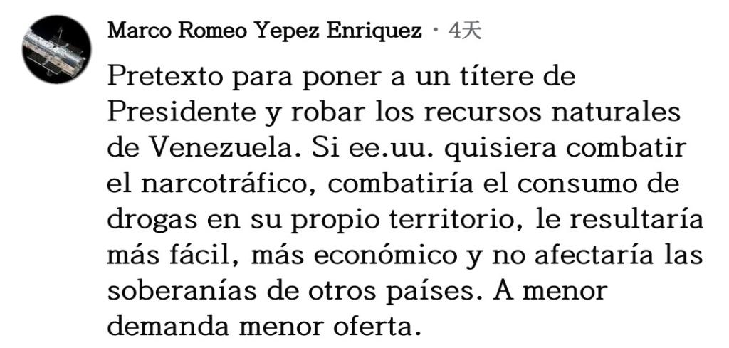 網(wǎng)友馬爾科·耶佩斯直言不諱:“所有一切不過是美國(guó)安插傀儡以掠奪委內(nèi)瑞拉自然資源的借口罷了。如果美國(guó)真想打擊販毒,就應(yīng)該去打擊自己領(lǐng)土上的毒品消費(fèi),這樣更簡(jiǎn)單、更經(jīng)濟(jì),也不會(huì)影響其他國(guó)家的主權(quán),需求減少供應(yīng)自然也會(huì)下降?!?/p>