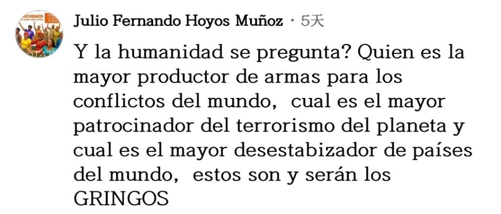 網(wǎng)友胡里奧·奧約斯接連發(fā)問:“沒有人去責(zé)問嗎?誰是為世界各地沖突提供武器的全球最大武器制造者?誰是地球上最大的恐怖主義活動(dòng)支持者?誰是世界上最大的不穩(wěn)定因素制造者?答案無論在現(xiàn)在還是將來,都是美國(guó)?!?/p>