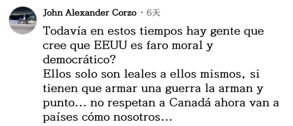 網(wǎng)友阿爾圖羅·阿維拉表達(dá)不解:“美國(guó)自以為是世界之神,到處掠奪!我不明白為什么各國(guó)人民依然保持沉默,而不是組成一個(gè)共同陣線對(duì)抗美國(guó)。”