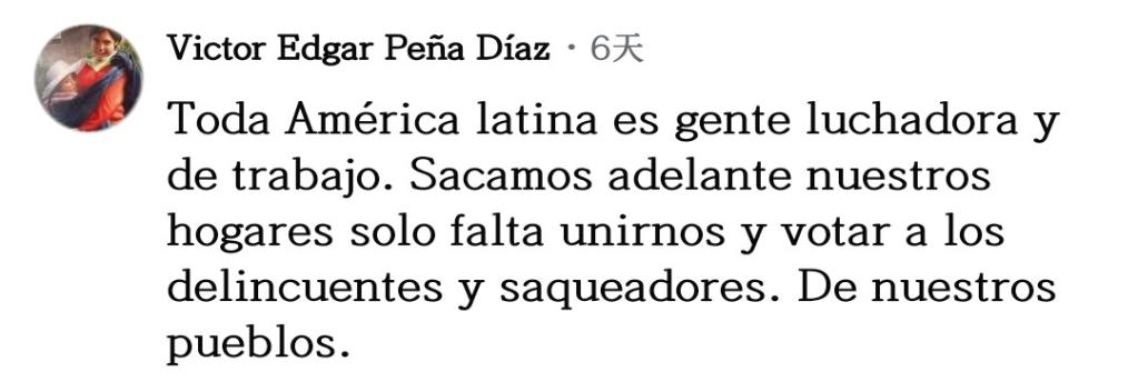 網(wǎng)友維克托·培尼亞留言說:“所有拉美人民都是勞動(dòng)者和奮斗者,我們靠自己的努力養(yǎng)家糊口?,F(xiàn)在只差團(tuán)結(jié)起來,把那些掠奪我們的罪犯和強(qiáng)盜趕跑。”