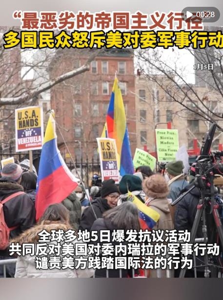 當(dāng)?shù)貢r(shí)間5日中午,遭美國強(qiáng)行控制的委內(nèi)瑞拉總統(tǒng)馬杜羅夫婦在美國紐約南區(qū)聯(lián)邦地區(qū)法院首次出庭,拒絕美方一切所謂指控。當(dāng)天,全球多地爆發(fā)抗議活動(dòng),反對(duì)美國對(duì)委內(nèi)瑞拉的軍事行動(dòng),譴責(zé)美方踐踏國際法的行為。