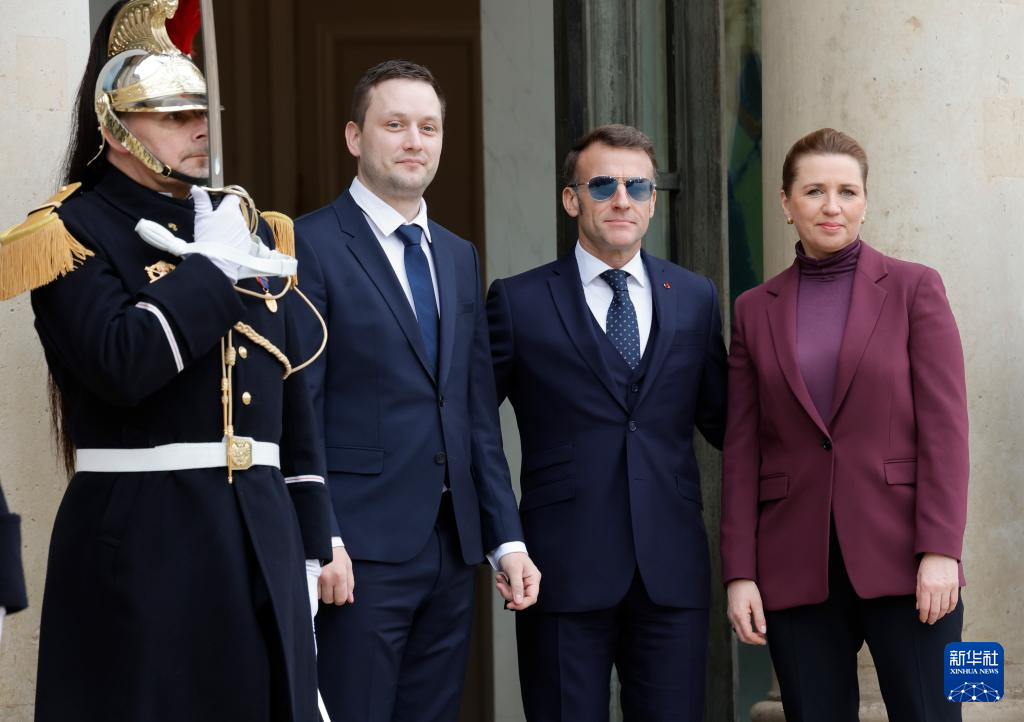 1月28日,法國(guó)總統(tǒng)馬克龍(右二)在巴黎歡迎到訪的丹麥?zhǔn)紫喔ダ诐衫锟松ㄓ乙唬┖透窳晏m島自治政府總理延斯-弗雷德里克·尼爾森(左二)。新華社發(fā)(亨利·施瓦茨攝)