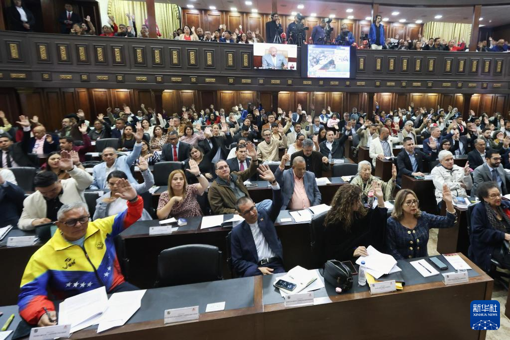 1月29日,在委內(nèi)瑞拉首都加拉加斯,議員們?cè)谖瘍?nèi)瑞拉立法機(jī)構(gòu)全國(guó)代表大會(huì)例行會(huì)議上舉手表決。新華社發(fā)(委內(nèi)瑞拉全國(guó)代表大會(huì)供圖)