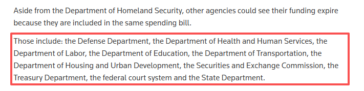 據(jù)路透社報(bào)道,美國國會每年需為438個聯(lián)邦機(jī)構(gòu)撥款,若未能履行該職責(zé),相關(guān)機(jī)構(gòu)必須停止所有非必要工作。此次部分“停擺”涉及多個關(guān)鍵部門,包括美國衛(wèi)生與公眾服務(wù)部、交通部、證券交易委員會、財(cái)政部、聯(lián)邦法院系統(tǒng)等。