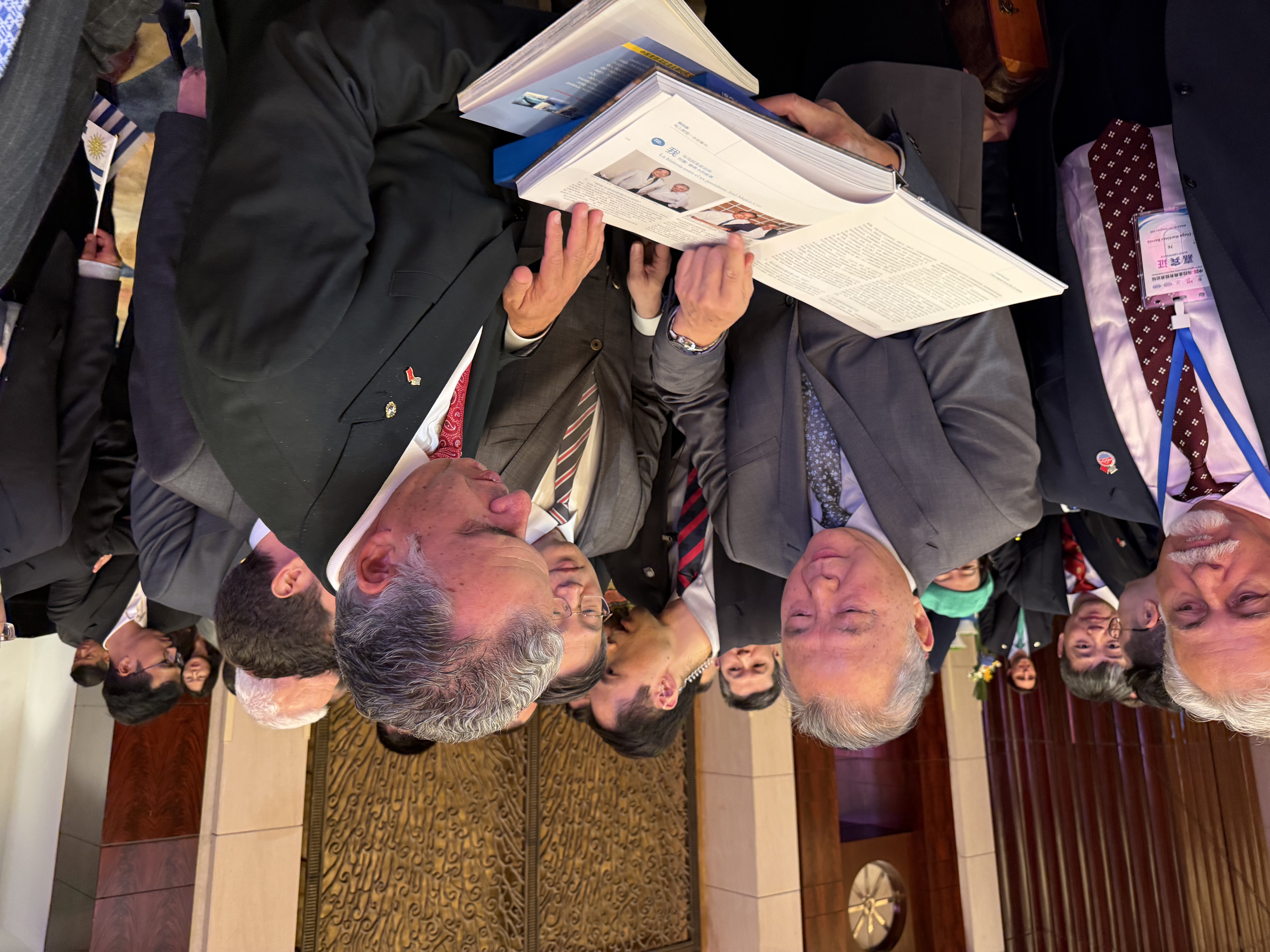 2026年2月6日,余熙(左)受邀出席烏拉圭總統(tǒng)亞曼杜·奧爾西在上海舉行的招待會(huì)活動(dòng)。圖為中國(guó)駐烏拉圭大使黃亞中(中)與烏拉圭總統(tǒng)翻閱兩部烏拉圭主題著作。 烏拉圭駐華大使館供圖