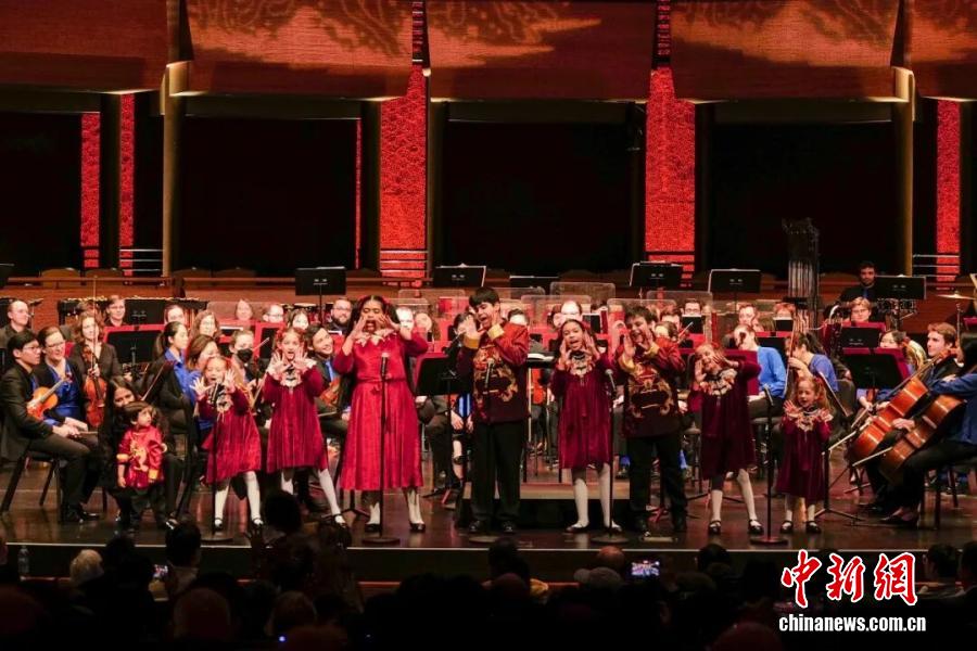 當?shù)貢r間2026年2月15日,第七屆“春之聲”中國新年音樂會在美國紐約林肯中心爵士樂中心玫瑰劇場舉行。圖為來自美國的兒童用中文表演歌曲串燒。 中新社記者 王帆 攝