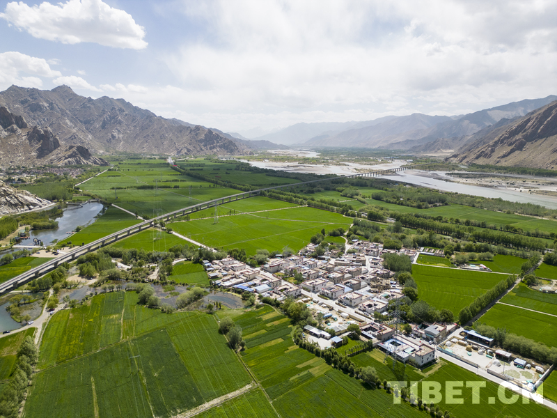 圖為拉薩市曲水縣,拉日鐵路從田野、河畔之中穿行而過,繪就一幅人與自然和諧相處的生態(tài)畫卷。 攝影:央拉