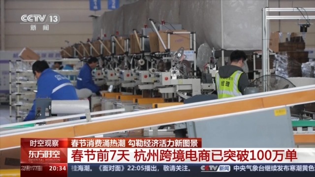 春節(jié)期間,在杭州跨境電商綜試區(qū),一排排貨架上整齊碼放著來(lái)自世界各地的“特產(chǎn)”,工作人員正在分揀、打包,一派繁忙景象。