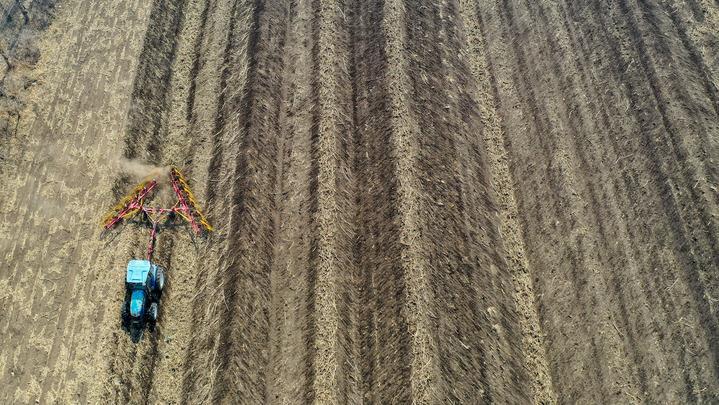 4月2日,在吉林省公主嶺市范家屯鎮(zhèn)乾程農(nóng)民專業(yè)合作社,農(nóng)民駕駛農(nóng)機(jī)整理耕地上的秸稈(無人機(jī)拍攝)。