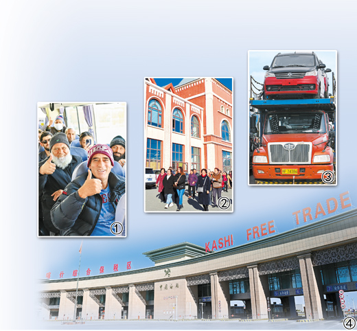 圖①:新疆紅其拉甫口岸,出境旅客在國際道路旅客班車上等待發(fā)車。新華社記者 丁 磊攝;圖②:新疆巴克圖口岸中哈邊民互市絲路文化商品城。新華社記者 茍立鋒攝;圖③:新疆霍爾果斯公路口岸等待出口的車輛。新華社記者 趙 戈攝;圖④:新疆喀什綜合保稅區(qū)。新華社記者 丁 磊攝