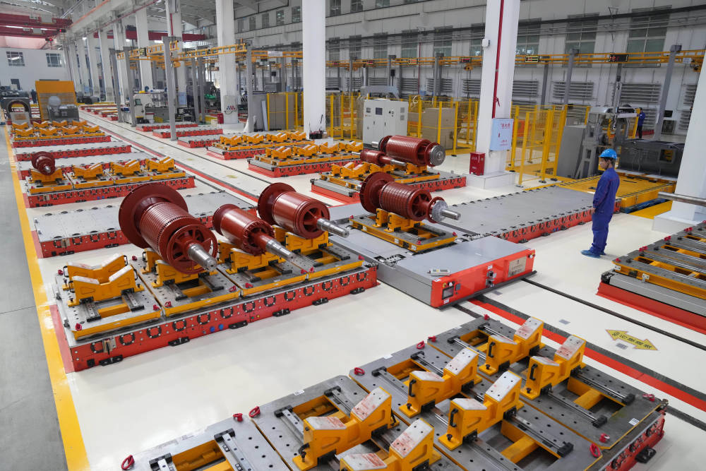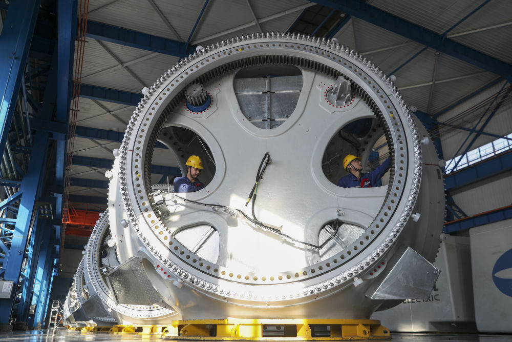 2024年3月5日,在位于黑龍江省齊齊哈爾市的中國(guó)一重集團(tuán)有限公司風(fēng)電裝備生產(chǎn)制造廠生產(chǎn)車間,工作人員在組裝設(shè)備。新華社記者 張濤 攝