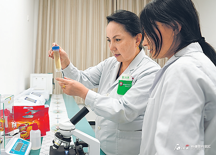 新疆醫(yī)資豪健康科技有限公司技術(shù)人員在研究配制新茶葉。乃比江·艾則孜攝