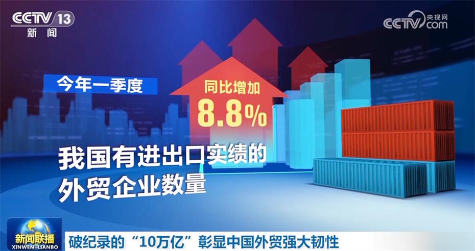 一季度,我國(guó)貨物貿(mào)易進(jìn)出口規(guī)模歷史同期首次突破10萬億元,增速創(chuàng)6個(gè)季度以來新高。一季度進(jìn)出口令人欣喜的數(shù)據(jù)彰顯了中國(guó)外貿(mào)的強(qiáng)大韌性,提振了人們對(duì)實(shí)現(xiàn)今年經(jīng)濟(jì)增長(zhǎng)目標(biāo)的信心。