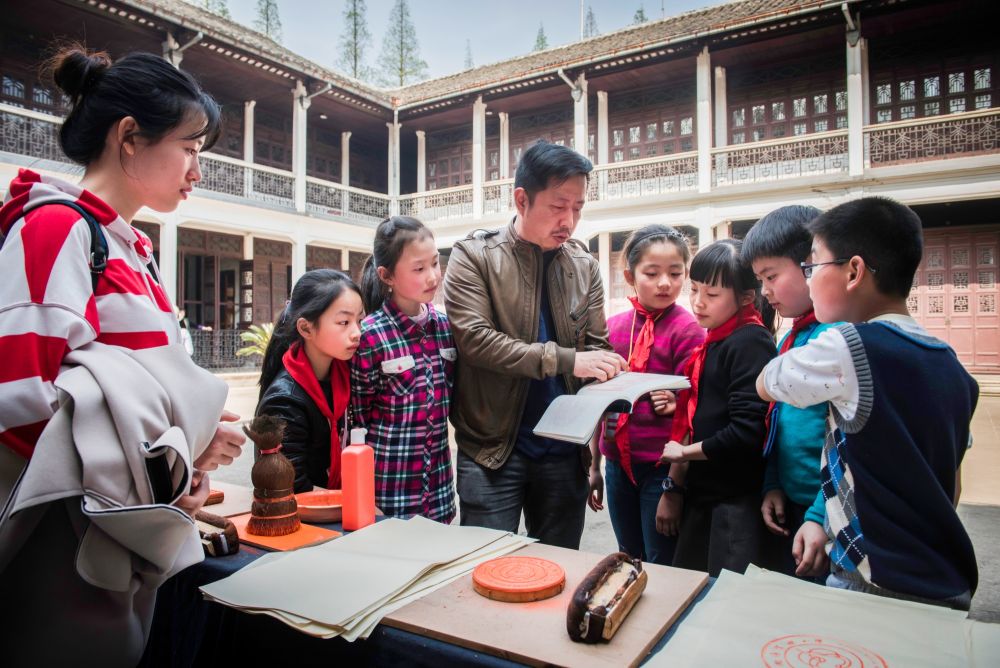 鄭宗男向?qū)W生介紹雕版印刷。(湖州市南潯區(qū)委宣傳部供圖)