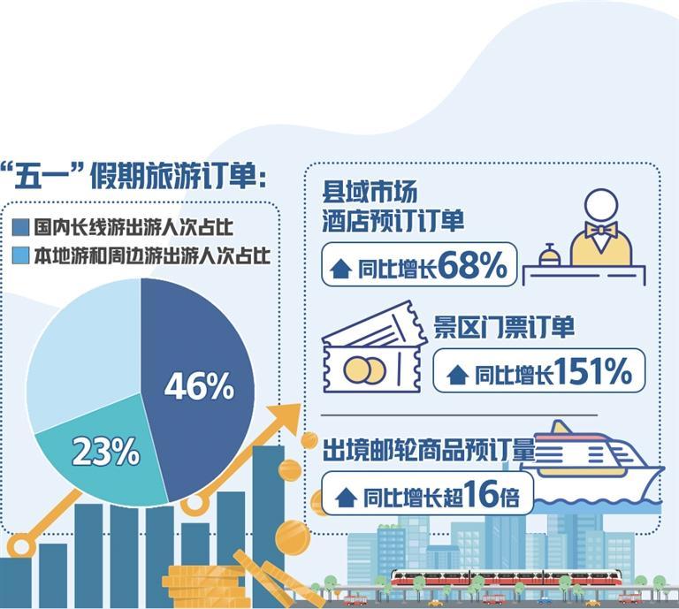 從出游目的地看,北京、上海、重慶、杭州、成都、南京、西安、武漢、廣州等城市是熱門,帶動相關(guān)交通和酒店訂單量走高。去哪兒旅行網(wǎng)顯示,北京—上海、成都—西安、上?!錆h、深圳—長沙、北京—青島等熱門線路的火車票預(yù)約購票難度不低于春運;從上海、北京、深圳、廣州、杭州、南京等地出發(fā),飛往旅游城市的機票平均支付價格走高,北京—成都、上?!ッ鞯葻衢T航線的部分航班已升至全價;在攜程旅行網(wǎng)上,天水、徐州、淄博、合肥、南昌、迪慶、煙臺等城市的“五一”假期酒店預(yù)訂增速明顯;四線及以下城市,尤其是縣域旅游市場帶來新增量,縣域市場酒店預(yù)訂訂單同比增長68%、景區(qū)門票訂單同比增長151%。
