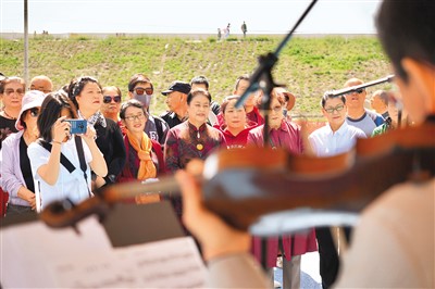 “我愛你,中國。我要把美好的青春獻給你,我的母親,我的祖國!”在軍墾之聲合唱團的帶領下,市民游客一起合唱《我愛你,中國》,歌聲嘹亮,場面熱烈。