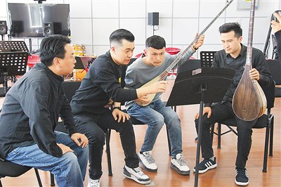 新疆藝術學院師生為中國交響樂團作曲家楊帆(左一)展示彈撥爾樂器。