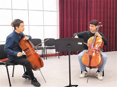 中國交響樂團大提琴副首席李成(左)指導新疆藝術學院學生。