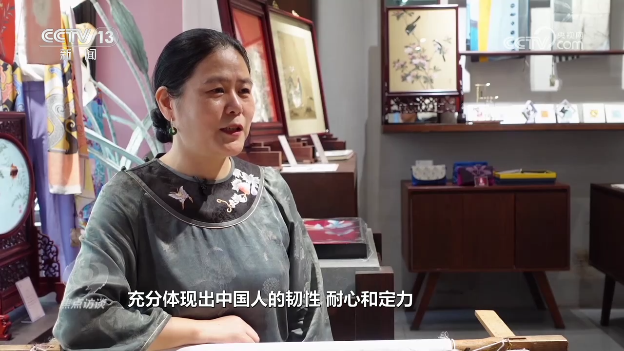 盧建英:“當(dāng)時(shí)我在繡一幅《桃花太平鳥圖》,習(xí)近平總書記走到了我的繃架前。他說(shuō)你好,很親切,很和藹,看得非常仔細(xì)。他說(shuō)中華文化的傳承力有多強(qiáng),通過(guò)這個(gè)蘇繡可以看出來(lái),像這樣的功夫充分體現(xiàn)出中國(guó)人的韌性、耐心和定力,這是中華民族精神的一部分,能得到總書記的認(rèn)可,真的是倍感榮耀?!?/p>