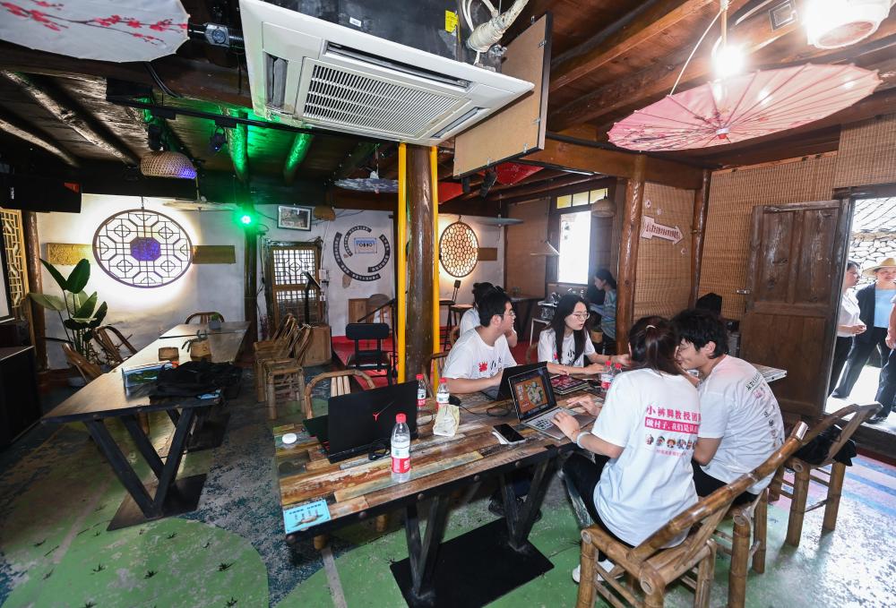 2023年8月11日,高校藝術(shù)院系的大學(xué)生們在寧波市寧海縣葛家村的特色酒吧內(nèi)討論村落藝術(shù)改造提升的設(shè)計方案。 新華社記者 徐昱 攝