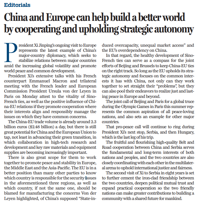 中國(guó)領(lǐng)導(dǎo)人此次歐洲之行旨在全球局勢(shì)日益動(dòng)蕩之際穩(wěn)定大國(guó)關(guān)系和中歐關(guān)系,促進(jìn)世界和平與共同發(fā)展。在促進(jìn)歐洲、中東和亞太地區(qū)的和平與穩(wěn)定方面,中歐雙方有很大的合作空間。只要?dú)W盟堅(jiān)持戰(zhàn)略自主,著眼于中歐共同利益,雙方不僅可以攜手合作,還可以為實(shí)現(xiàn)歐洲和歐洲以外地區(qū)公正與持久的和平共同努力,為世界和平與發(fā)展以及人類的進(jìn)步作出新的貢獻(xiàn)。