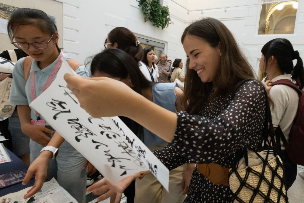 2023年8月29日,嘉賓在匈牙利布達(dá)佩斯“美美與共——中國(guó)匈牙利詩(shī)歌吟誦會(huì)”暨“漢字與中華文明”展上體驗(yàn)中國(guó)書(shū)法。