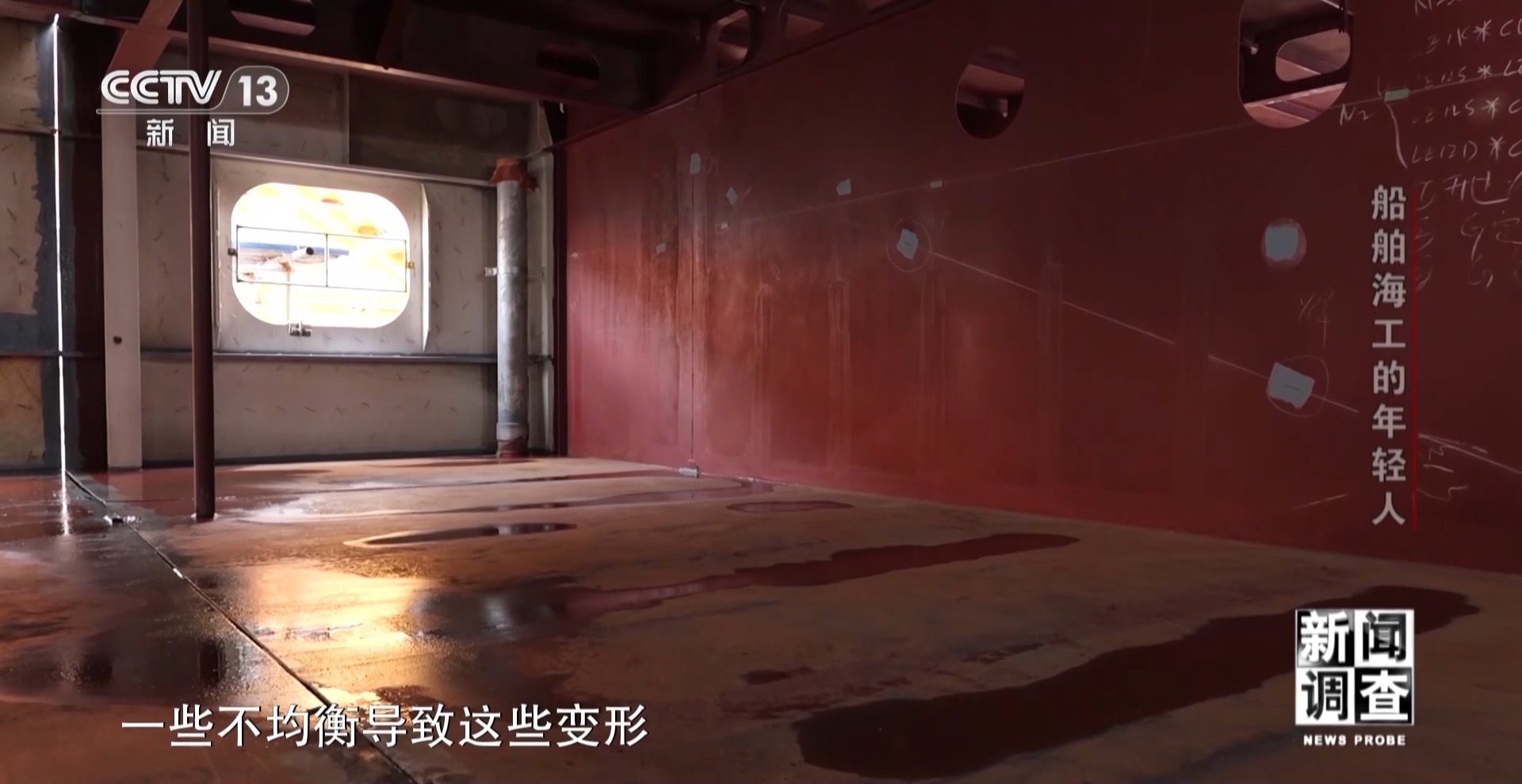 上海外高橋造船有限公司精度技術(shù)部副部長 孫建志:這個總段是典型的薄板結(jié)構(gòu),不平程度在正負(fù)15毫米之內(nèi)。所有的變形都是熱的影響,熱輸入以后就會產(chǎn)生殘余應(yīng)力,一些不均衡導(dǎo)致這些變形。尤其是薄板結(jié)構(gòu)更明顯,現(xiàn)在2號船的整體的平整度應(yīng)該相對1號船已經(jīng)好很多了。